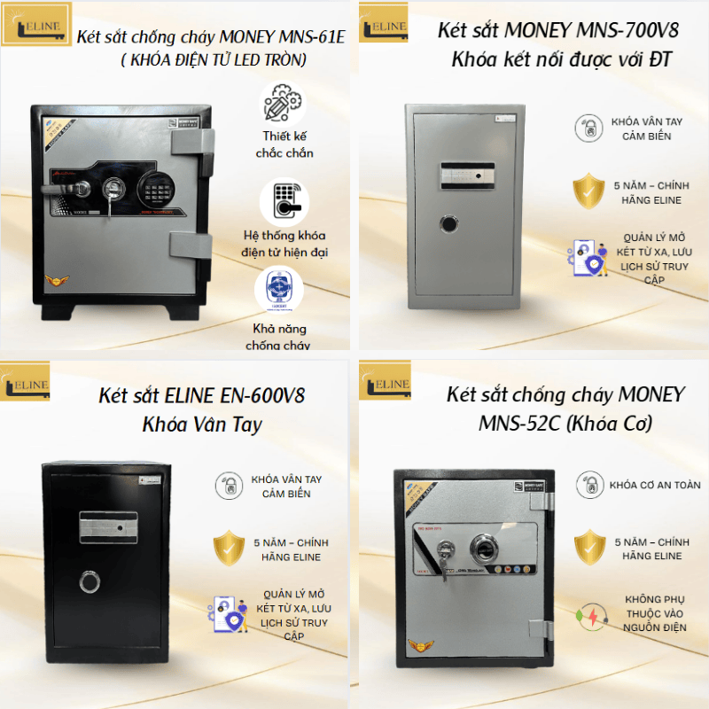 Eline luôn tiên phong trong việc kiến tạo các dòng sản phẩm két sắt với mẫu mã phong phú, kiểu dáng tinh tế và hiện đại, dễ dàng phù hợp với nhiều không gian nội thất khác nhau. Chúng tôi không chỉ chú trọng vào tính thẩm mỹ mà còn tích hợp các giải pháp bảo mật: