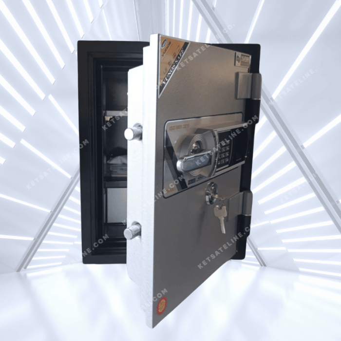 Két được cấu tạo từ thép nguyên khối kết hợp vật liệu chống cháy nhiều lớp, chịu nhiệt đến 1000°C trong 60 phút, giúp bảo vệ tiền mặt, giấy tờ và tài sản quan trọng khi xảy ra hỏa hoạn.
